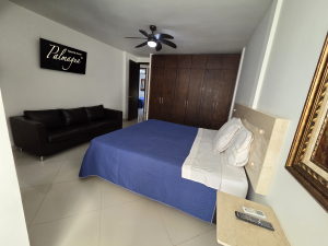 Alcoba principal con baño interno, una cama King, que se puede separar dejando dos camas sencillas, sofá grande, escritorio con su silla, TV led smar tv , con Netflix, aire mini Split, abanico de techo, cajilla de seguridad, Closet amplio en madera.