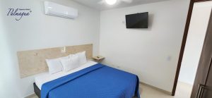 Alcoba principal con cama doble, TV. Led Smart tv, aire mini split, abanico de techo, cajilla de seguridad.