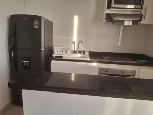 Área de labores con su lavadora, lavadero, tendedero de ropas. Sala con 2 sofá en cuero, uno de dos puestos y otro de tres puestos, mesa de centro en mármol, Comedor de 6 puestos en madera, Balcón grande con 4 sillas, wifi.