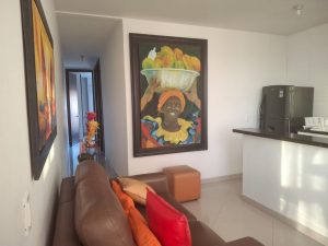 Alcoba Principal con cama King, se pueden separar quedando dos camas sencillas, TV led Smart tv, aire mini Split, abanico de techo, cajilla de seguridad, baño entre alcobas, Alcoba 2: cama doble, abanico de techo, aire mini Split, TV led con Netflix, Baño dos completo, área de labores con su lavadero y lavadora, cocina integral amplia con su nevera, estufa con horno a gas, horno microondas, menaje para cuatro personas, agua caliente, comedor de madera de cuatro puestos, sala con un sofá doble y dos sencillos, mesa de centro en vidrio, balcón con dos sillas.